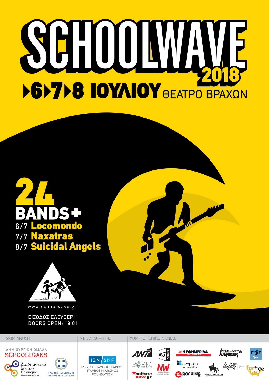 Έρχεται κύμα! Εδώ και 14 χρόνια, το Schoolwave είναι το κύμα που περιμένουν κάθε καλοκαίρι χιλιάδες παιδιά. Φέτος έρχεται στις 6, 7 και 8 Ιουλίου στο Θέατρο Βράχων. Πάνω του ανεβαίνουν 24 μαθητικά και φοιτητικά συγκροτήματα απ’όλη την Ελλάδα και τρεις special guests: Locomondo (6/7), Naxatras (7/7) και Suicidal Angels (8/7). Το στίγμα στο Schoolwave 2018 δίνει η Θεσσαλονίκη. Είναι η πρώτη φορά που τόσες πολλές μπάντες (9 από τις 24!) προέρχονται από την πιο ανήσυχη μουσικά πόλη της Ελλάδας. Κατά τα άλλα, είναι ένα κλασικό Schoolwave με παιδιά πάνω και κάτω από τη σκηνή να εκπροσωπούν διαφορετικά είδη μουσικής, διαφορετικές πόλεις, διαφορετικές φυλές: Hard rock από Χανιά, death metal από Αθήνα, skate punk από Πειραιά, πολυφωνικά παραδοσιακά από Σέρρες! Το Schoolwave 2018 διοργανώνει η Δημιουργική Ομάδα Schooligans σε συνεργασία με την Περιφέρεια Αττικής και το Διαδημοτικό Δίκτυο Πολιτισμού Βύρωνα, Δάφνης – Υμηττού, με Μέγα Δωρητή το Ίδρυμα Σταύρος Νιάρχος. Την επιλογή των 24 συγκροτημάτων, ανάμεσα στα 108 που δήλωσαν συμμετοχή, ανέλαβαν φέτος οι: Νίκος Κυπουργός (συνθέτης), Vassilikos (τραγουδοποιός), Μπάμπης Παπαδόπουλος (κιθαρίστας και συνθέτης), Λάμπης Κουντουρόγιαννης (κιθαρίστας και τραγουδοποιός), Γιώργος Μουχταρίδης (διευθυντής του ραδιοφωνικού σταθμού Pepper), Χρυσόστομος Μουράτογλου (μουσικός παραγωγός) και Χρήστος Ιωαννίδης (Schooligans).