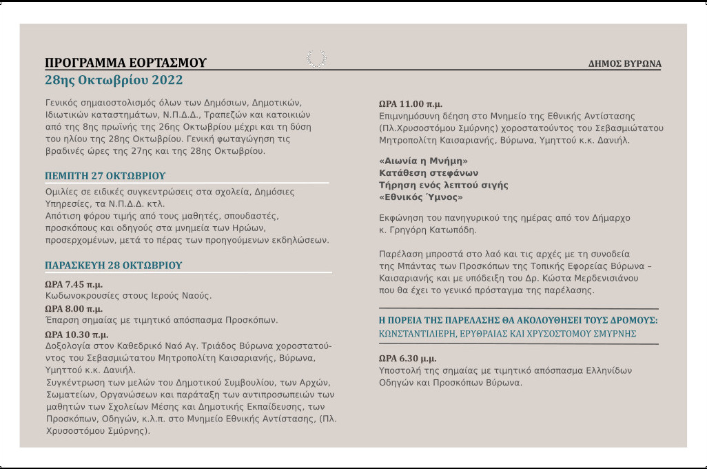 Πρόγραμμα: Γενικός Σημαιοστολισμός όλων των Δημοσίων, Δημοτικών, Ιδιωτικών καταστημάτων, Ν.Π.Δ.Δ., Τραπεζών και σπιτιών από της 8ης πρωινής της 26ης Οκτωβρίου μέχρι και τη δύση του ηλίου της 28ης Οκτωβρίου. Γενική φωταγώγηση τις βραδινές ώρες της 27ης και 28ης Οκτωβρίου. Πέμπτη 27 Οκτωβρίου: Ομιλίες σε ειδικές συγκεντρώσεις στα σχολεία, Δημόσιες Υπηρεσίες, τα Ν.Π.Δ.Δ, κ.λ.π. Απότιση φόρου τιμής από τους μαθητές σπουδαστές προσκόπους και οδηγούς στα μνημεία Ηρώων, προσερχομένων, μετά πέρας των προηγούμενων εκδηλώσεων. Παρασκευή 28 Οκτωβρίου: Ώρα 7.45 π.μ., Κωδωνοκρουσίες στους Ιερούς Ναούς. Ώρα 8.00 π.μ. Έπαρση σημαίας με τιμητικό απόσπασμα Προσκόπων Ώρα 10.30 π.μ. Δοξολογία στον Καθεδρικό Ναό Αγ. Τριάδος Βύρωνα, χοροστατούντος του Σεβασμιώτατου Μητροπολίτη Καισαριανής, Βύρωνα, Υμηττού κ.κ. Δανιήλ. Συγκέντρωση των μελών του Δημοτικού Συμβουλίου, των Αρχών, Σωματείων, Οργανώσεων και παράταξη των αντιπροσωπειών των μαθητών των Σχολείων Μέσης και Δημοτικής Εκπαίδευσης, των Προσκόπων, Οδηγών, κ.λ.π. στο Μνημείο Εθνικής Αντίστασης, (πλατεία Χρυσοστόμου Σμύρνης.) Ώρα 11.00 π.μ. Επιμνημόσυνη δέηση στο Μνημείο της Εθνικής Αντίστασης (Πλατεία Χρ. Σμύρνης), χοροστατούντος του Σεβασμιώτατου Μητροπολίτη Καισαριανής, Βύρωνα, Υμηττού κ.κ. Δανιήλ. 'Αιώνια η Μνήμη' Κατάθεση στεφάνων Τήρηση ενός λεπτού σιγής 'Εθνικός Ύμνος' Εκφώνηση του πανηγυρικού της ημέρας από τον Δήμαρχο κ.Γρηγόρη Κατωπόδη. Παρέλαση μπροστά στο λαό και τις αρχές με τη συνοδεία της Μπάντας των Προσκόπων της Τοπικής Εφορείας Βύρωνα - Καισαριανής και με την υπόδειξη του κ. Μερδενισιάνου που θα έχει το γενικό πρόσταγμα της παρέλασης. Η πορεία της παρέλασης θα ακολουθήσει τους δρόμους: Κωνσταντιλιέρη, Ερυθραίας και Χρυσοστόμου Σμύρνης. Ώρα 18.30 μ.μ. Υποστολή της σημαίας με τιμητικό απόσπασμα Ελληνίδων Οδηγών και Προσκόπων Βύρωνα.