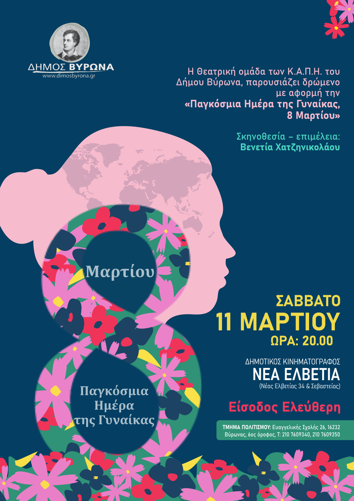 «ΠΑΓΚΟΣΜΙΑ ΗΜΕΡΑ ΓΥΝΑΙΚΑΣ» Κατέχει πράγματι η γυναίκα ισότιμη θέση με τον άντρα στην Αρχαία Σπάρτη, όπως μας μαθαίνουν στο σχολείο; Τι παθαίνει μια γυναίκα που δείχνει ενδιαφέρον για τις επιστήμες στον Μεσαίωνα; Τι κοινό έχουν η Σταχτοπούτα, με τον Μόγλη, την Χιονάτη και τον Νέμο; Τι σημαίνει η έκφραση «Μπρος στα κάλλη τι είναι ο πόνος» που λέμε στα κορίτσια μας; Τι σχέση έχει η ανακάλυψη του D.N.A. με το δικαίωμα ψήφου στις γυναίκες; Σ’ αυτά και άλλα πολλά ερωτήματα θα απαντήσουμε το ΣΑΒΒΑΤΟ 11 ΜΑΡΤΙΟΥ, στις 8:00 μ.μ., στον δημοτικό Κινηματογράφο «Νέα Ελβετία», σε μια Ιστορική αναδρομή στη θέση της γυναίκας στις πατριαρχικές κοινωνίες, από την αρχαιότητα έως σήμερα, με αρκετή δόση χιούμορ, προβολές βίντεο, αλλά και συγκίνηση. Αφίσα: Βασιλική Μακράκη Ήχος- Φώς: Πάρης Γεωργούλης Σκηνοθεσία- Κείμενα- Βίντεο- Μουσική επιμέλεια: Χατζηνικολάου Βενετία