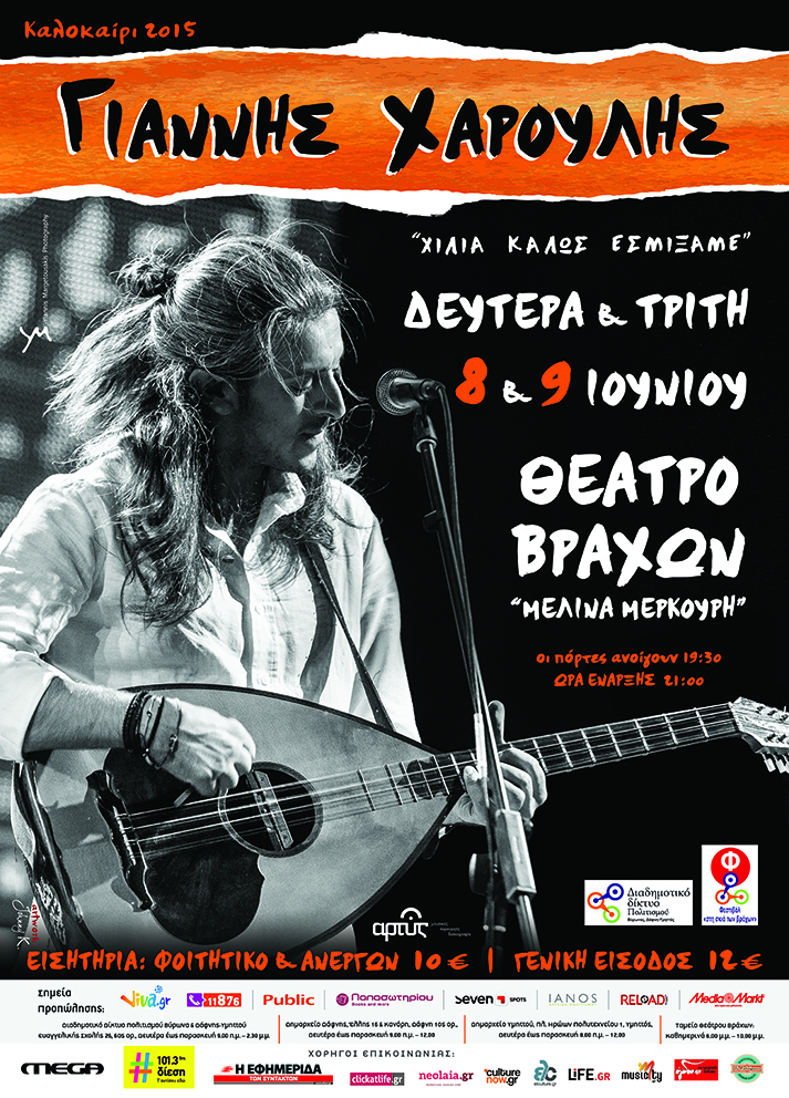 Ο Γιάννης Χαρούλης, μετά τις sold out παραστάσεις του το χειμώνα, τόσο στην Ελλάδα, όσο και στο εξωτερικό- στην πρώτη του Ευρωπαϊκή περιοδεία-και μετά την κυκλοφορία του τελευταίου του δίσκου «Χίλια καλώς εσμίξαμε», ανεβαίνει στο θέατρο Βράχων για να ξαναζήσει μαζί μας και εμείς μαζί του την μοναδική εμπειρία των live παραστάσεων του. Με το λαούτο του και όλα όσα προκαλεί η ιδιαίτερη φωνή και παρουσία πάνω στη σκηνή, σε ένα οδοιπορικό στο χθες που ξυπνάει τις μουσικές μνήμες και στο σήμερα που χτίζει το μουσικό μας μέλλον. Ανήσυχος και πρωτοπόρος από την μια, παραδοσιακός από την άλλη, ροκάρει με το λαούτο του σε μουσικά μονοπάτια όπου ο ηλεκτρισμός συναντά αρχέγονους ήχους της Κρήτης. Η παράδοση, η λαϊκή ιστορία, η σύγχρονη δημιουργία, οι ποιητές μας, οι στιχουργοί μας, τραγούδια που αγαπήσαμε, στίχοι που τραγουδήσαμε, θα γίνουν ένα με τη φωνή του Γιάννη Χαρούλη, θα γίνουν ένα με τις φωνές των χιλιάδων που θα αγκαλιάσουν και πάλι αυτή την μουσική εμπειρία.