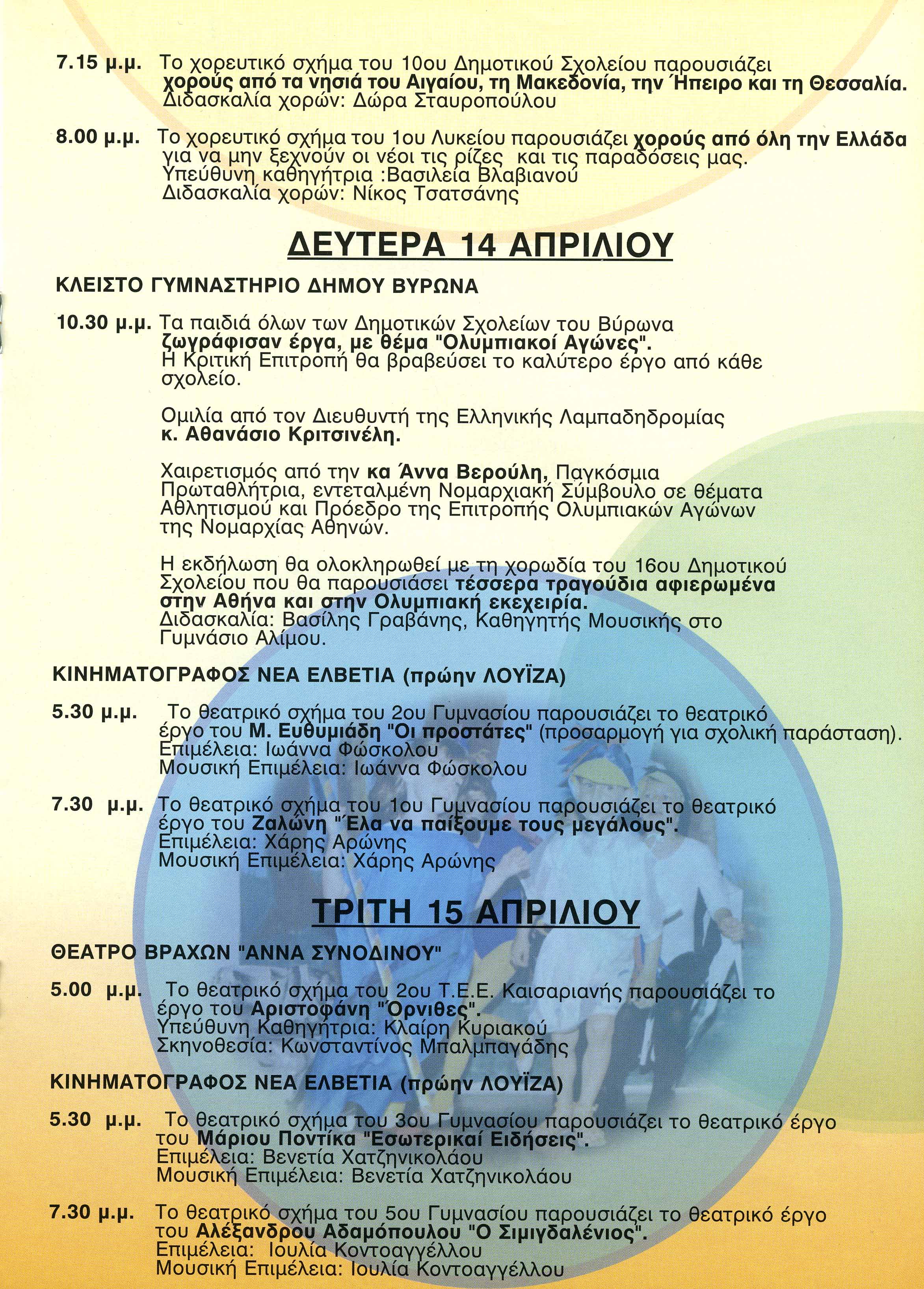 Η εκδήλωση θα ολοκληρωθεί με τη χορωδία του 16ου Δημοτικού Σχολείου που θα παρουσιάσει τέσσερα τραγούδια αφιερωμένα στην Αθήνα και στην Ολυμπιακή εκεχειρία.