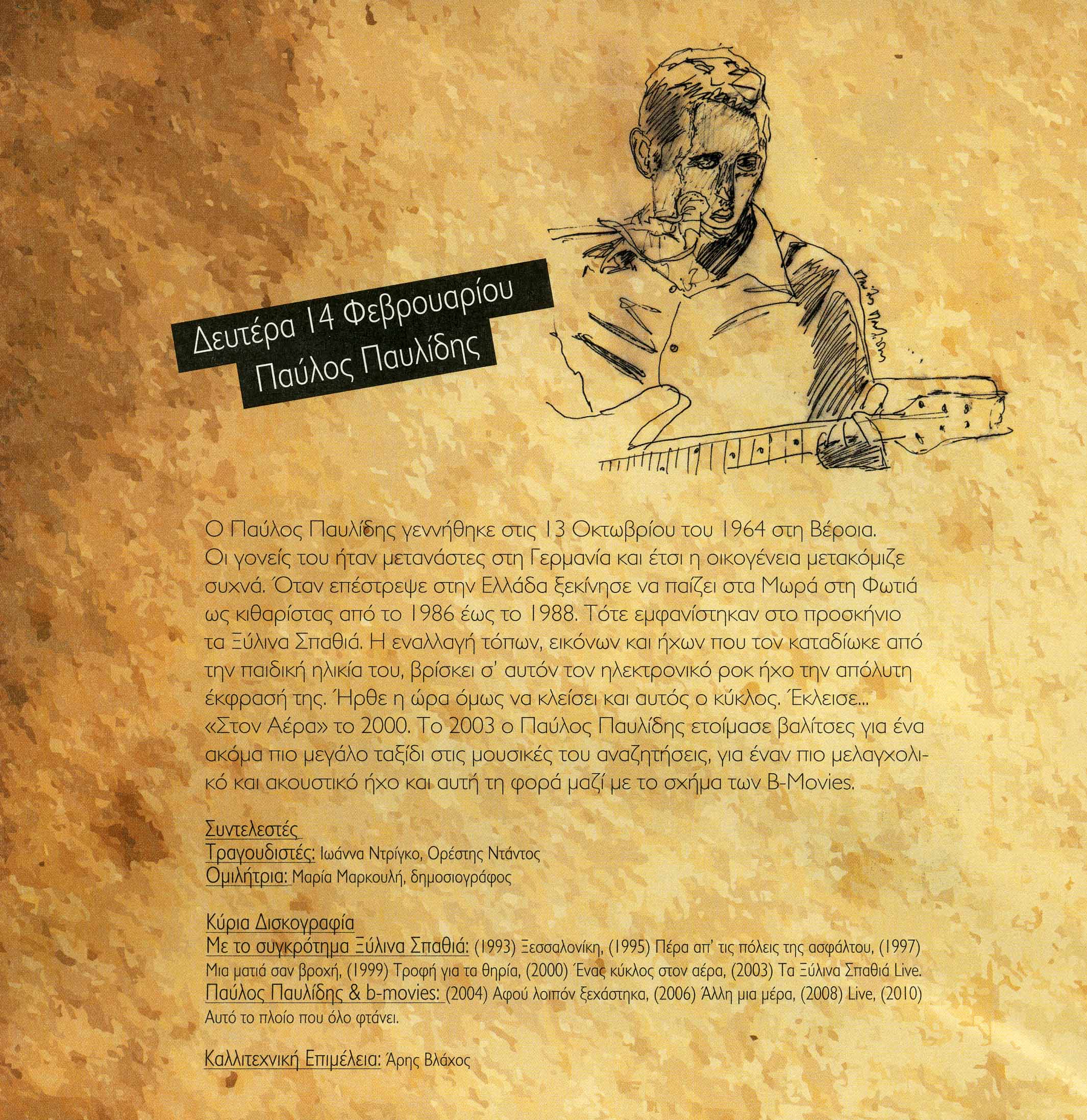 Ο Παύλος Παυλίδης γεννήθηκε στις 13 Οκτωβρίου του 1964 στη Βέροια. Οι γονείς του ήταν μετανάστες στη Γερμανία και έτσι η οικογένεια μετακόμιζε συχνά. Όταν επέστρεψε στην Ελλάδα ξεκίνησε να παίζει στα Μωρά στη Φωτιά ως κιθαρίστας από το 1986 έως το 1988. Τότε εμφανίστηκαν στο προσκήνιο τα Ξύλινα Σπαθιά. Η εναλλαγή τόπων, εικόνων και ήχων που τον καταδίωκε από την παιδική ηλικία του, βρίσκει σ' αυτόν τον ηλεκτρονικό ροκ ήχο την απόλυτη έκφρασή της. Ήρθε η ώρα όμως να κλείσει και αυτός ο κύκλος. Έκλεισε... «Στον Αέρα» το 2000. Το 2003 ο Παύλος Παυλίδης ετοίμασε βαλίτσες για ένα ακόμα πιο μεγάλο ταξίδι στις μουσικές του αναζητήσεις, για έναν πιο μελαγχολικό και ακουστικό ήχο και αυτή τη φορά μαζί με το σχήμα των B-Movies. Κύρια Δισκογραφία Με το συγκρότημα Ξ ύλινα Σπαθιά: (1993) Θεσσαλονίκη, (1995) Πέρα απ' τις πόλεις της ασφάλτου, (1997) Μια ματιά σαν βροχή, (1999) Τροφή για τα θηρία, (2000) Ένας κύκλος στον αέρα, (2003) Τα Ξύλινα Σπαθιά Live. Παύλος Παυλίδης & b-movies: (2004) Αφού λοιπόν ξεχάστηκα, (2006) Άλλη μια μέρα, (2008) Live, (2010) Αυτό το πλοίο που όλο φτάνει.