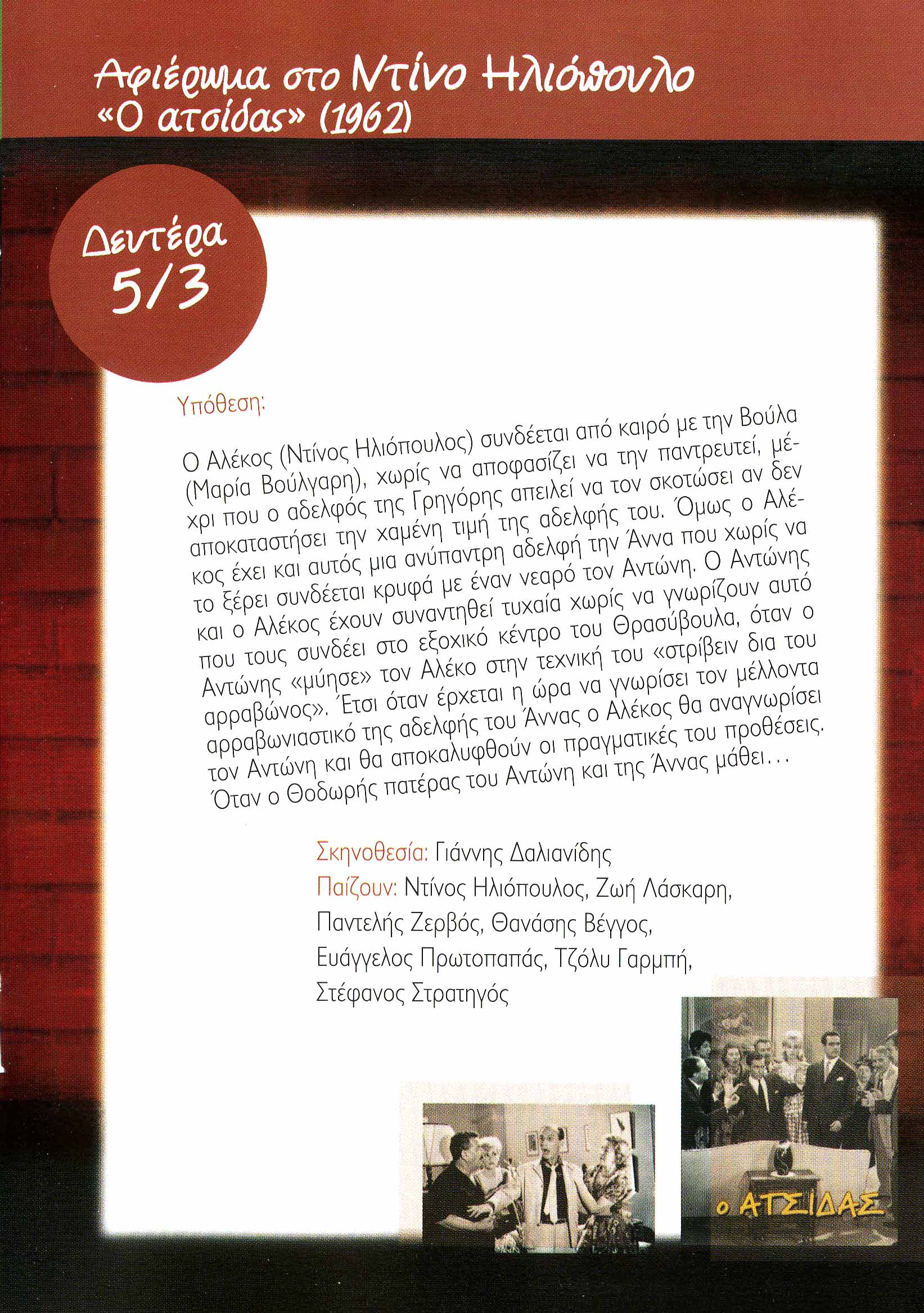 Πλαίσιο Εκδήλωσης: Κινηματογραφικές βραδιές - αφιερώματα σε πρωταγωνιστές του ελληνικού σινεμά