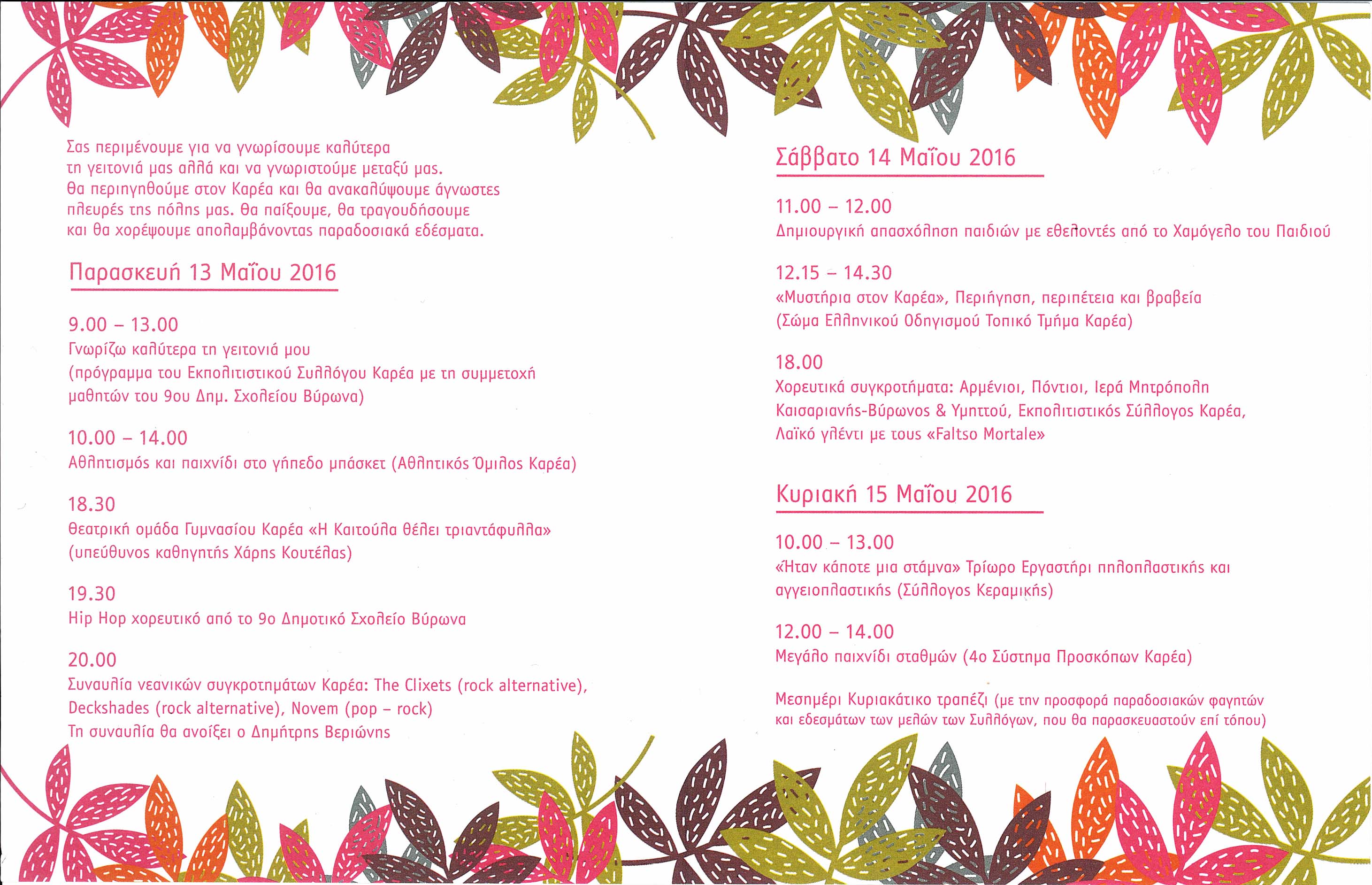 Σας περιμένουμε για να γνωρίσουμε καλύτερα τη γειτονιά μας αλλά και να γνωριστούμε μεταξύ μας. Θα περιηγηθούμε στον Καρέα και θα ανακαλύψουμε άγνωστες πλευρές της πόλης μας. Θα παίξουμε, θα τραγουδήσουμε και θα χορέψουμε απολαμβάνοντας παραδοσιακά εδέσματα.